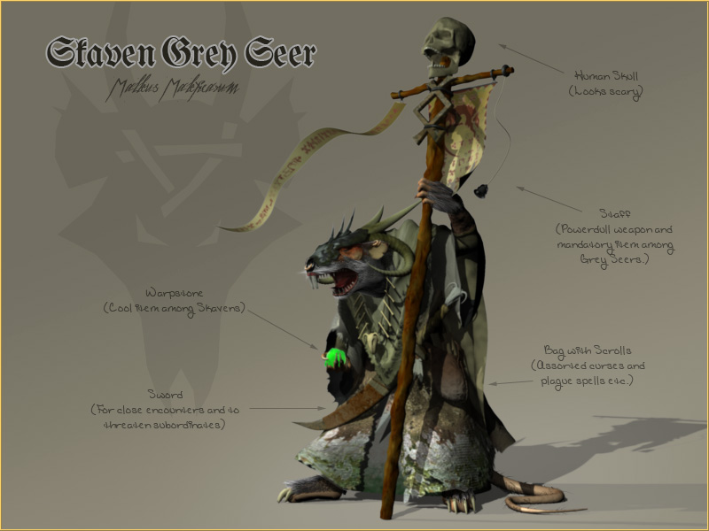 Seers are very rare among Skavens (thank god) and only the best of them survive the hard training that starts just after birth. The most distinguished mark of these ratlings are the fact that they have grey or even white fur but most important of all is that they have horns springing out of their backhead.