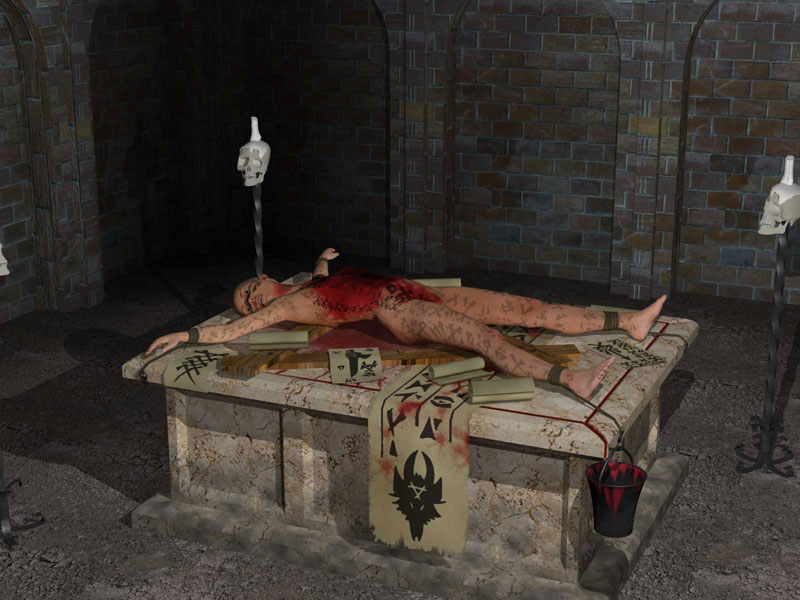 The image to the left shows the result of some of the wicked work from these creatures. A young girl has been sacrificed to please the ratmens evil god- The Horned Rat. We can only speculate of what blessings it might have resulted in….if any?