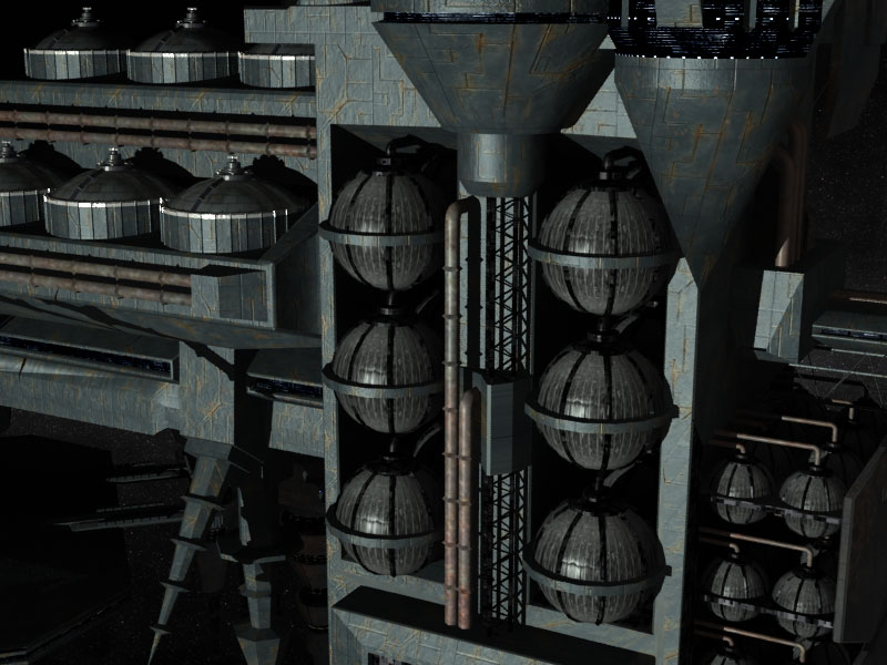 After refining the products are divided into liquids are gasses and are stored respectively. The gasses, mostly ethane, propane, butanes and pentanes.are kept under high pressure and low temperature. From here the products are either distributed to Scintilla or to the numerous docking stations around Scintilla Prime to feed the ever hungry freighters and cruisers for their voyages between the stars.